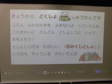 今日から13日(金)までの2週間、「図書館まつり」を行います。主な取組は①1・2年生を対象にした図書委員さんによる読み聞かせ ②家庭読書の木 ③おみくじ読書 です。