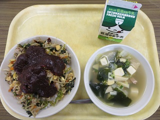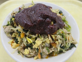 今日のビビンバは、大豆の部分が大きくかみごたえがある、大豆もやしを使ったかみかみメニューです。