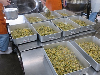 豆腐とわかめのスープには、豆腐、わかめ、ベーコン、竹の子、白菜、青ねぎが入っています。青ねぎは四日市産です。