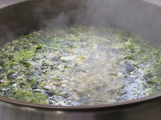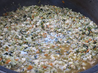 削節でだしをとり、にんじん、玉ねぎ、キャベツ、小松菜、豆腐を入れて、調味料で味付けをしてじっくり煮込みました。
