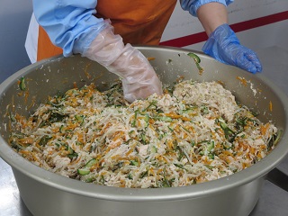 冷やし中華は日本で生まれた料理です。暑い時期でも麺類をおいしく食べられるよう、味付けにお酢を使ってさっぱりとさせる工夫がしてあります。今日は具材にかみごたえのある茎わかめが入っています。