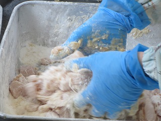 鶏肉をしょうが、酒、しょうゆに漬け込み、米粉と片栗粉を合わせた粉をまぶして油で揚げます。