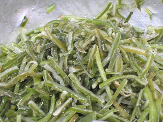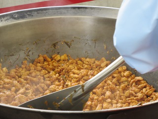さとう、みりん、しょうゆ、酢、ねぎを合わせてたれを作り、揚げた鶏肉をからめます。