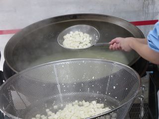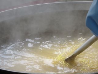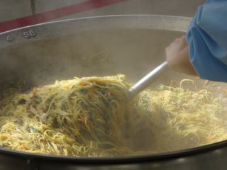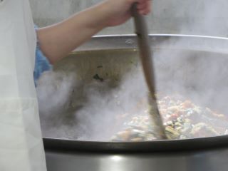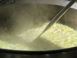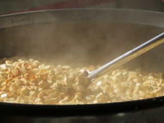 玉ねぎ、たけのこ、チンゲン菜を炒めたところにさつまいもとあじを加えて調味料で味付けします。