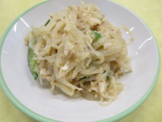 春雨、ささみ、もやし、きゅうりをバンバンジードレッシングで和えました。