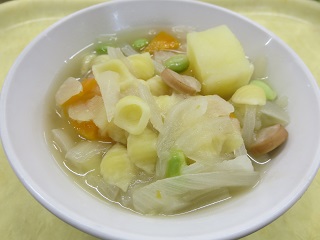 野菜のスープ煮には、ソーセージやマカロニ、たくさんの野菜を入れてじっくり煮込んで作りました。