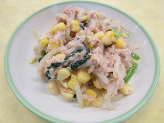 ツナ、小松菜、もやし、コーンをドレッシングで和えました。