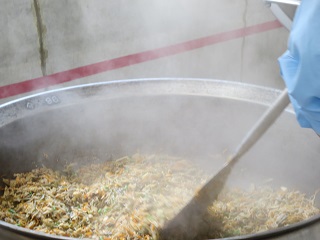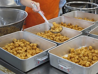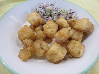 米粉と片栗粉を合わせた粉をまぶして油で揚げます。