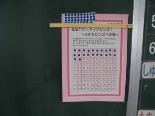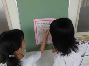 今日から始まった「生活パワーアップビンゴ」。朝の会で昨日と今朝の生活を振り返り、達成できた項目にチェックを入れます。5項目すべて達成できると1ビンゴ、「クラスで100ビンゴへの道」シートにシールを貼っていきます。楽しみながら、自己の生活習慣を見直してもらえればと思います。