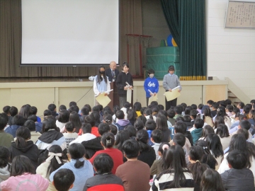 また児童会代表委員の子たちが「冬休みを安全に楽しく過ごすために大切なこと」をクイズ形式で話してくれました。最後にクイズの答えの文字を並び替えると「よいおとしを」になるように考えられていて、みんな楽しく、真剣に話を聞いていました。