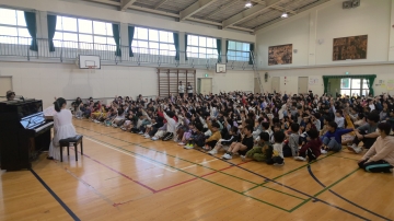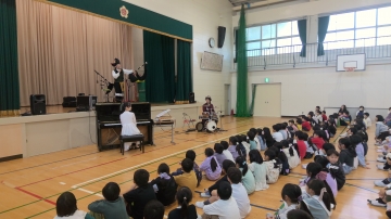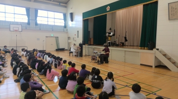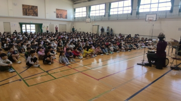 本日3,4時間目に、全校児童が観劇(音楽鑑賞)を楽しみました。本校ではいろいろな芸術に触れるために、毎年劇団や音楽グループに来ていただいています。今日はスペインの民族楽器「バグパイプ」を中心とする音楽グループの演奏を鑑賞しました。珍しい楽器でしたが、実はその楽器を使っているよく知っている曲がたくさん登場して、楽しく鑑賞することができました。