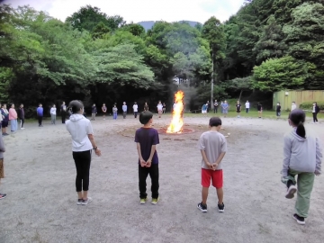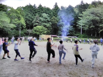 自然教室といえば、思い出に残るのはなんといってもキャンプファイヤーです。セレモニーから始まって、昨年の運動会でも踊ったダンスで一気に盛り上がりました。