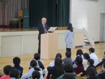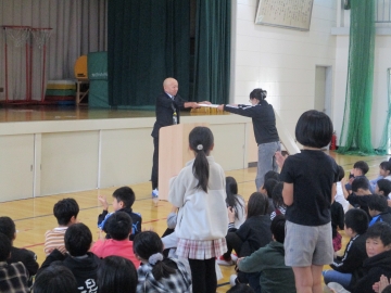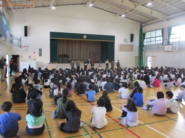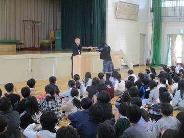 本日の5時間目に学校集会を行いました。まずはじめに「三泗小中科学展」「三泗小中社会科展」「三泗小中美術展」「読書感想文コンクール」の学校代表児童の表彰を行いました。その次に「後期委員会委員長」の認証を行いました。それぞれ学校の代表に対して、みんなから温かい拍手が送られました。今日の学校集会も「笑顔と優しさのあふれる学校」が感じれらるひとときでした。
