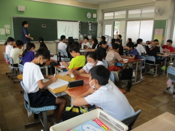 下の写真は今日の6年生の授業の様子です。仲間とともに1学期の復習などを一生懸命に頑張ったあとは、仲間とともにお楽しみ会を思いきり楽しんでいました。終業式を明日にひかえ、どの学年もお楽しみ会や転出していく子とのお別れ会を仲間とともに楽しんでいました。1学期頑張ったからこそ、みんな楽しそうでした!