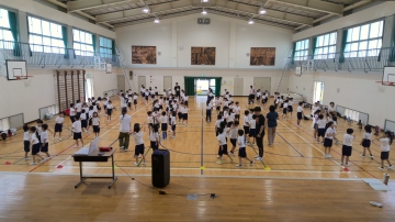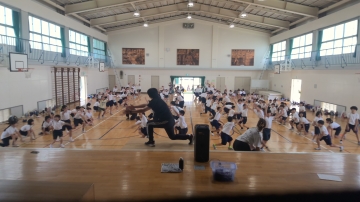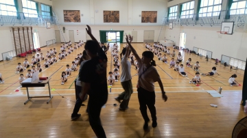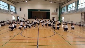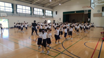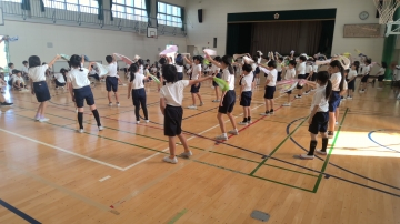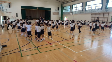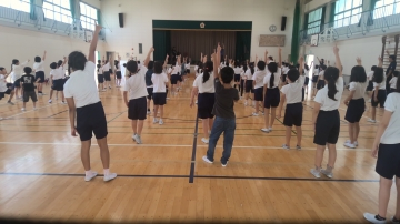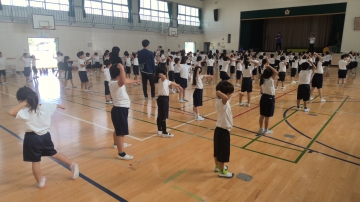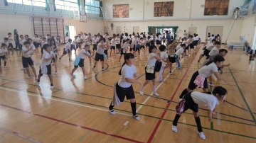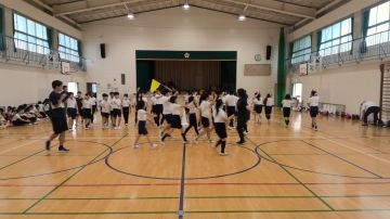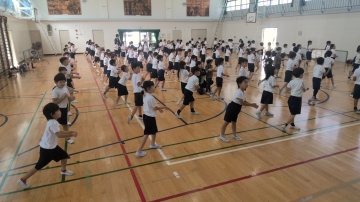 運動会の練習が始まっています。どの学年も一生懸命に頑張っていて、表現運動やダンスの動きがどんどんじょうずになっています。特にダンスの「曲のリズムにのる」動きがすごくよくなっています。表現運動やダンスの練習も少しずつステップアップすることで「できた」「もう少しやりたい」という意欲を大切にしています。下の写真は順に1,2年生、3,4年生の練習の様子です。曲が流れると自然に体が動き出し、すごく楽しそうでした。