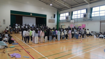 2年生は「6年生はカリスマ」というテーマで、6年生が学校のためにしてくれていたことを紹介しながら、曲とダンスで感謝の気持ちをあらわしました。最後には6年生もいっしょにダンスに加わってすごく盛り上がりました。