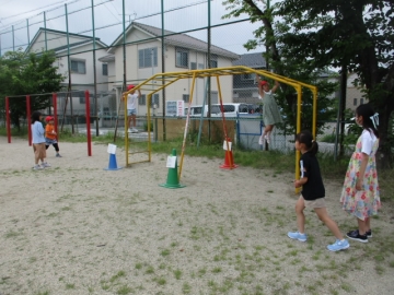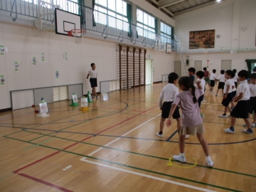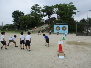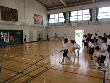 | 今日も「泊山USJ特集」です。本年度の泊山USJには、体育館に「投げる」新アトラクションができました!キャラクターの的を狙って赤白玉を投げる運動遊びで、今日の20分休みは3年生が優先参加の日でした。だんだんと遠くの的を狙いたくなるように、近くの的や遠くの的が工夫してあり、3年生は遠くの的も「狙って投げる」子が多かったです。また、運動場では大谷翔平選手からプレゼントしていただいたグローブも活用して「投げる」アトラクションとうんていが人気で、連日挑戦しにきて異学年の子とも仲良くなり、お互いに記録の更新をしようと励まし合う姿も見られました。ほんと運動って、心もほぐれていいですね。