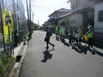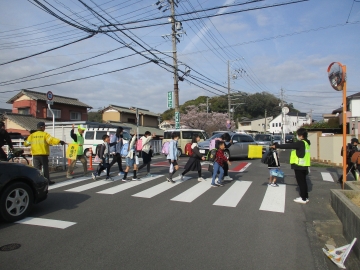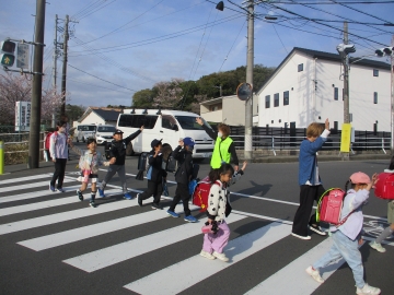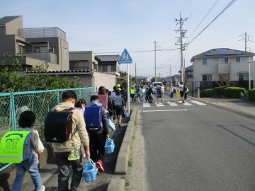 本校では、登下校時にPTAの保護者や見守りボランティアの方々が、危険箇所に立っていただいたり、学校まで付き添って来ていただいたりしています。各地区から子どもたちと歩いて学校まで来てくださる方もたくさんいて、最後は学校の前に10名以上の方が並んで、みんなに「おはようございます」「いってらっしゃい」などと優しい声をかけて見送っていただいています。1年生の中には慣れない学校生活に不安な子もいますが、見守りボランティアの方々が優しく声をかけながら付き添って学校まで来ていただくおかげで元気に登校できています。本当にありがとうございます!
