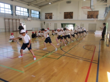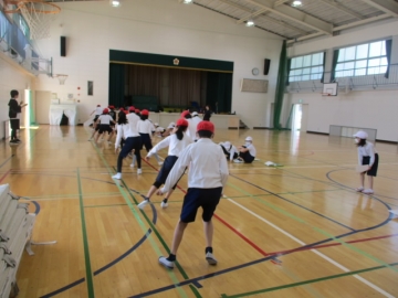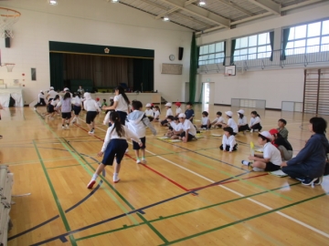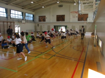 本校では、体力向上の取組の一つとして、毎年5月のこの時期に全学年で体力テストを行っています。1年生は初めての体力テストとなりますが、2年生から6年生は昨年度の自分の記録を超えることを目標に一生懸命に頑張っています。下の写真は兄弟学年の2年B組と5年B組が反復横跳びに挑戦している様子です。5年生が2年生の記録をみるとともに、5年生の何人かが2年生の間に入って見本の動きを見せながら行うことで、お互いによいかかわりが生まれていました。2年生が終わると、いよいよ5年生の本番です。「膝を曲げて体勢を低くする」などのポイントを意識しながら、真剣に記録に挑戦していました。