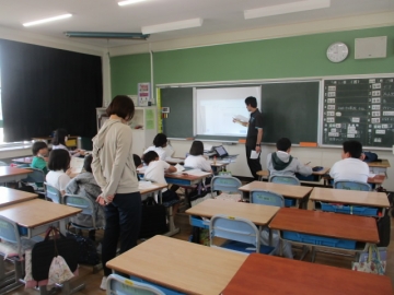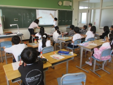 本校では、学力の定着・向上のためにタブレットパソコンや画面を黒板に投影するプロジェクターなどのICT機器の効果的な活用を進めています。下の写真は6年生が国語の時間に自分の考えをタブレットパソコンに入力し、それを教師のパソコン上で把握して授業を進める様子と、4年生が算数の少人数授業で黒板にプロジェクターで投影した資料をもとに子どもたちと教師が関わりながら授業を進める様子です。