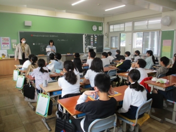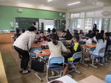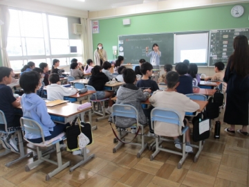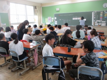小学校の外国語の授業は、5,6年生が週に2時間、3,4年生が週に1時間、英語を学習します。また本校では5,6年生の英語の授業は教科担任制を実施しています。さらに6年生の英語の授業には、南中学校区の「学びの一体化授業」として月に1回程度、南中学校の先生にも来ていただいています。下の写真は今日の6年生の英語の授業の様子です。南中学校の先生にも教えていただいて、楽しくかかわりながら英語に親しんでいました。