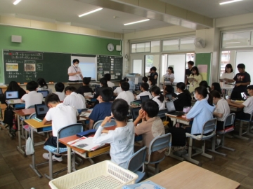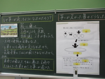 本校では「わかる授業」のために、教師の授業力向上に取り組んでいます。今日は6年B組の社会の授業を全職員で見て、子どもたちにとって「わかりやすい授業であったか」を検討する授業研究を行いました。授業のはじめにまずICT機器を活用して資料からわかることを書き、その後グループで学び合いをして意見を交流し、「なぜ争いが起こるようになったのか」を考えていきました。最後に授業の大切なポイントをクイズ形式で確認したときには「わかった!」という声が聞かれ、他のクラスの授業でも参考にできる工夫がたくさんありました。 なお、今週のホームページで特集してきた算数の「わかる授業のための工夫」の残りの1年生、2年生の様子は、来週お伝えします。