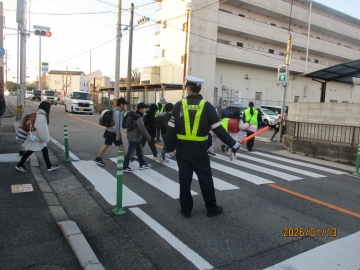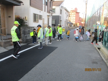 で、見守りボランティアや保護者の方々の他にも、警察や交通安全協会の方々に危険箇所に立っていただいていました。大変寒い中、ありがとうございました。