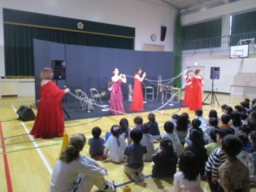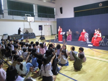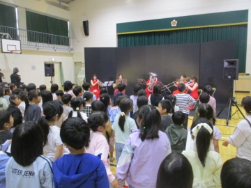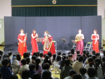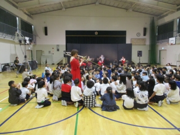 本日「学び舎音楽会」が行われ、「ブラスアンサンブル・ロゼ」という5人の演奏家による金管五重奏を鑑賞させていただきました。「学び舎音楽会」は四日市市文化まちづくり財団の主催、岡田文化財団の助成により、四日市市内の子どもたちに本格的な音楽に触れる機会をつくっていただくというもので、本校は昨年度に引き続きの鑑賞となりました。すばらしい演奏の他にも、いろいろな金管楽器の吹き方や音色をクイズ形式で楽しく教えていただいたり、泊山小学校の校歌を演奏していただいていっしょに歌ったり、子どもたちは音楽の楽しさに浸っていました。
