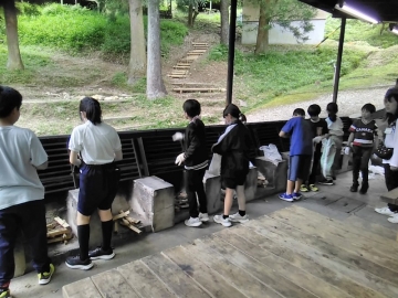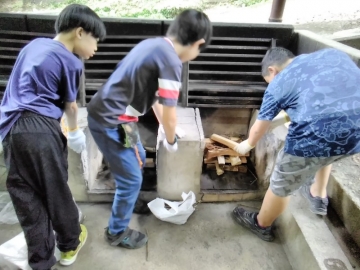 みんな元気に時間も守って、よく協力して行動できています。そのおかげで時間に余裕ができてきたので、明日の野外炊事の準備もしました。明日は雨の予報なので、今のうちに乾いた杉のかれ枝などを集めて、井桁の準備をしました。野外炊事場は屋根があるので、これで準備万端です。