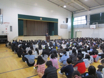 本日、6年生による人権フォーラム報告、人権ポスター学校代表の表彰、2学期の終業式を順に行いました。終業式では2学期に授業や掃除などを一生懸命頑張ったことを褒めるとともに、冬休みには学校と同じように家でも学習と掃除を一生懸命頑張るように話をしました。