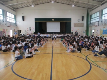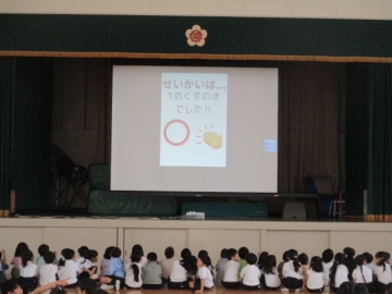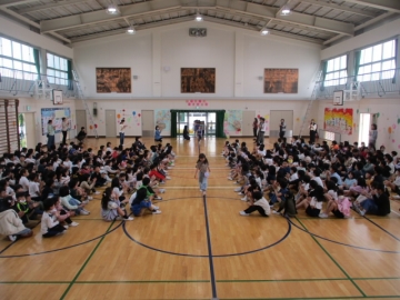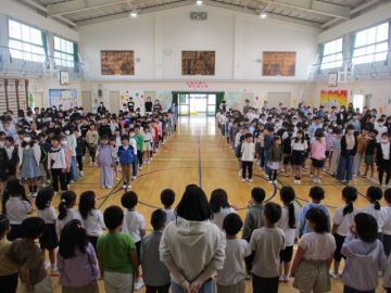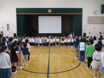 認証式後、1年生が一人一人名前を呼ばれて入場するのを2年生から6年生のみんなが笑顔と拍手で迎えました。入場するときには元気に手を振る1年生の子もいて、会場全体が「笑顔と優しさのあふれる」雰囲気につつまれていました。入場の後、みんなでクイズをしたり、校歌を歌ったりして楽しい時間を過ごしました。