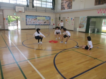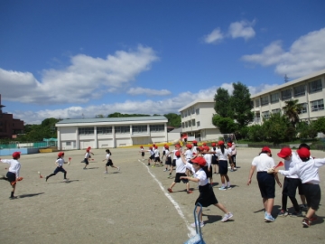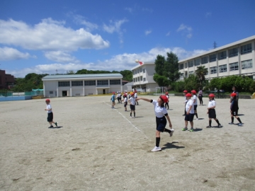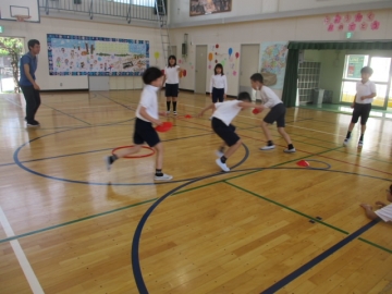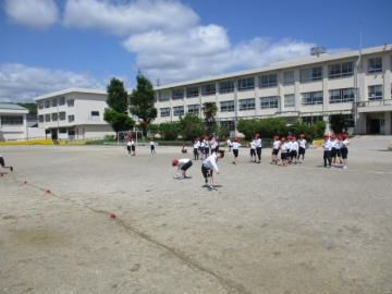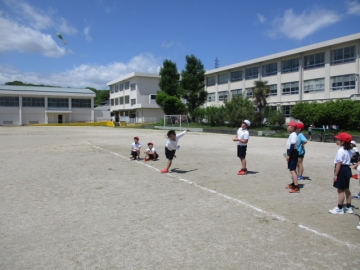 今日は雨もあがってよい天気となり、運動場で元気に運動する姿が見られました。本校では、学力向上とともに体力向上にも力を入れており、まずそのために体育の授業を工夫しています。今日の体育の授業では3年生と4年生が運動場で「投げる」力を伸ばすために、やわらかい「ジャベリックボール」を使って記録に挑戦していました。また体育館の授業では4年生が5つのマーカーを3人で取り合うゲームをしていました。体育の授業はチームでかかわりあうことで仲間づくりにもつながります。