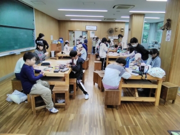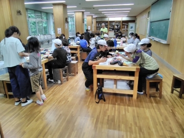 カヤック体験はクラスごとに交代なので、同じ時間に木でつくる「木ーホルダー」を自然教室の記念に作成しました。思い出の品として持ち帰ります。