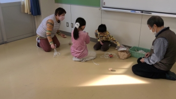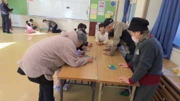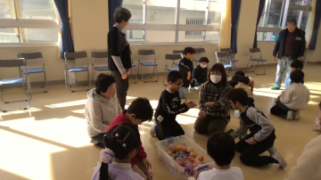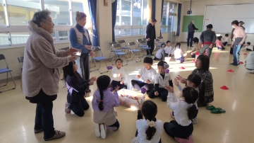 本日、1年生が生活科の授業で「昔遊び」体験を行いました。日頃、登下校の見守りでお世話になっている地域のボランティアや日永地区ついたち会(老人会)の方々をゲストティーチャーにお招きして、交流を兼ねて行いました。けん玉、おはじき、コマ回し、お手玉、めんこ、凧揚げを体験し、コツを教えていただきながら、どんどん上手になっていきました。
