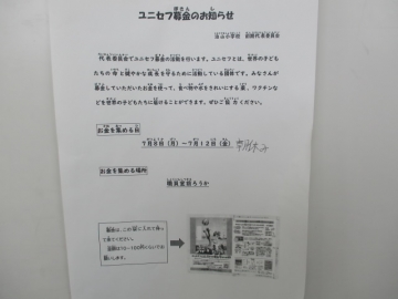 7月8日月曜日から12日金曜日まで、児童会代表委員の呼びかけで、ユニセフの募金活動を行っています。各クラスに掲示してあるお知らせには「みなさんが募金してくれたお金で、食べ物や水をきれいにする薬、ワクチンなどを世界中の子どもたちに届けることができます」と書いてあります。今朝も代表委員の子たちが「100円あれば、5リットルの水をきれいにする薬が131個届けられるんだよ」などと説明しながら、募金を呼びかけていました。世界中の子どもたちが、泊山小学校の子どもたちと同じように「笑顔と優しさのあふれる」生活ができるといいですね。