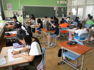 下の写真は今日の4年生と5年生の授業の様子です。1学期の復習をタブレットパソコンなどのICT機器も活用して、自主的に一生懸命に頑張る姿が見られました。もうすぐ夏休みということで、学習に向かう子どもたちの表情も嬉しそうです。夏休みを安全に過ごすために大切なことを、本日配付の「泊山っ子だより」の「校長の目」のコーナーに3点載せました。またそれについて、今日の朝の会の放送で直接校長から読み聞かせをしました。ご家庭でも再度、子どもたちといっしょに読んでいただき、夏休みを安全に過ごせるように確認をお願いします。