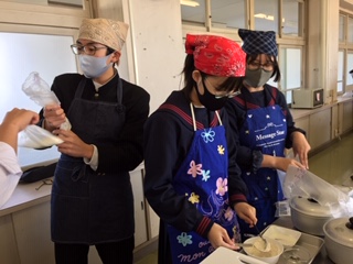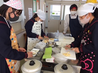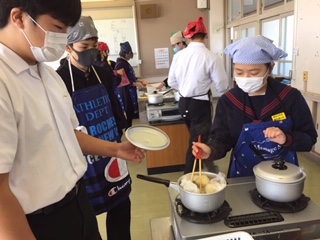 3年生では「幼児の生活と家族」という分野を学習しています。その一環で「幼児のおやつ作り」の調理実習を行いました。今年度の実習は、密を避けて自分の分は自分で作る防災レシピです。ビニール袋に、ホットケーキミックス、牛乳、油、さつまいのを入れ混ぜ、ゆで蒸しパンを作りました。見た目は鬼まんじゅうのようです。とっても美味しくできました。これなら、幼児も喜んでくれると思います。今日はA組でした。来週は、B組C組も行います。