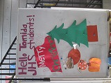 生徒の授業の様子は、密をさけるためにも廊下から授業の様子を参観する形ですべての学年を巡回していただきました。まず、目に留まったのは、生徒昇降口に展示してある、三重とこわか国体大会に向けて美術部が作成してくれた「都道府県応援のぼり旗」です。心がいっぱいこもった作品にみなさんお褒めの言葉をいっぱいいただきました。