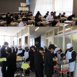 本日から給食がスタートです!1年生にとっては、中学校での初めての給食でした。しかし、1年生の子どもたちは、小学校での経験を生かして、スムーズに配膳をすることができました。各クラスとも食缶が空になるほど、当番の人が上手く盛りつけてくれました!後片付けも初めてにしてはスムーズに終えることができました!