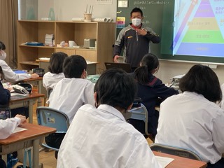 11月20日(木)4限目に、富田地区連合自主防災隊 隊長の渡部さん、減災アドバイザーの北河さん、地区市民センター地域マネージャーの坂本さんをお招きして、1年生防災講話が行われました。富田地区連合自主防災隊や、南海トラフ巨大地震が富田地区に及ぼすと想定される被害について、お話を聞かせていただきました。お話の最後には、「自分を守る・家族を守る・町(富田)を守る」という自助・共助のことを伝えてもらいました。
