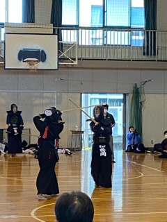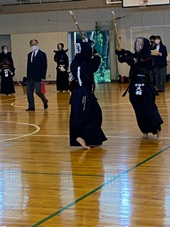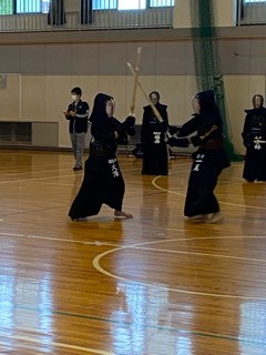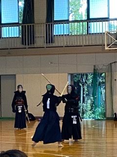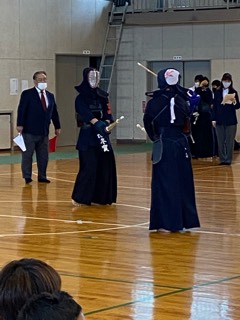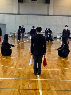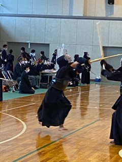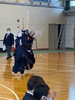 剣道の2日目は男子の個人戦と団体戦です。写真は午前中の個人戦の様子です。個人戦は、大会での試合が初めての1年生B戦、経験を積んだ2年生のA戦とが行われました。気合いを入れて、果敢に攻める2年生の姿。夏の大会よりさらにレベルアップしています。1年生は初めてで緊張もあり、やや動きは硬かったですが一生懸命に2分間を戦い切りました。2年生の冬賀さんと橋岡さんが2回戦に進みました。