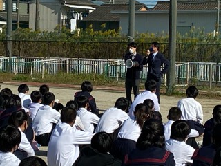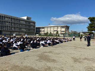 校長先生からは、全校生徒の冷静で迅速な行動に対してのお褒めの言葉がありました。また、自分の身を守るための行動を一番に考えることとあわせて、地域の中の大切な一員として、助け合いながら、周りの人たちのことも考えた行動がとれるようになってほしいともお話しもいただきました。この後、1年生は四日市北警察署南側へ二次避難として移動しました。
