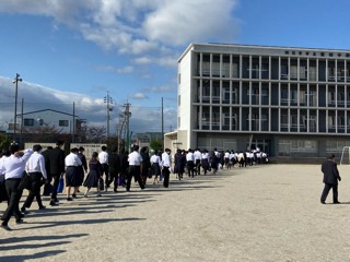 本日、5限目に今年度3回目の全校避難訓練を実施しました。震度6の地震と津波警報発令を想定した訓練。教室から一時避難場所であるグラウンドまでの移動、整列・点呼・報告までスムーズに行われました。教室内から最終のクラスの人員点呼ができるまで3分25秒。
