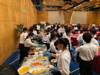 今日はうずしお観潮船の乗船時間に合わせて、朝食時間も少し早めです。しっかりと食べて、今日一日のエネルギーを補給します。食事を盛り付けるのも、きれいに早くできるようになってきました。