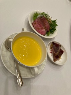 夕食のはじめは、スープと鰹のたたきとローストビーフです。