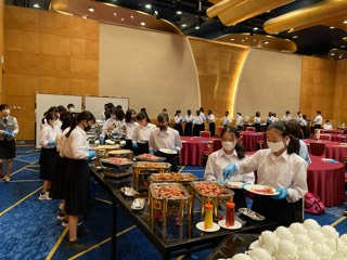 朝食会場で、好きな食べ物をお皿に取っています。きれいに盛り付けられるでしょうか?