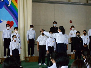 3年生全員が体育館に集まり、本番と同じ立ち位置で歌いました。今年度は、コロナ感染症対策のため、マスク着用とともに、隣の人と間隔を開けての合唱となります。