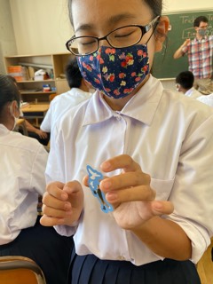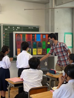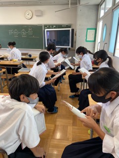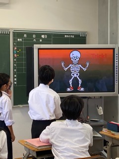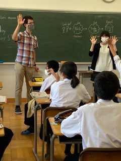5限目1Cの英語授業の様子です。英語指導員YEFのウェスリーと授業担当の塚﨑先生とのTT授業をすすめています。本時のテーマは、中間テストの振り返りを含めた「疑問詞を使って友だちに質問を考えよう」。2名の先生の授業は20分間ほぼ英語のみ。ハロウィンの内容も取り入れながら、生徒たちは全員が楽しく授業に参加しています。ペアでの質問もみんな英語のみ。1年生の10月で、生徒たちの「聴きとる力(リスニング)」と「話す力(スピーキング)」の向上には正直驚きました。小学校での英語の教科化と中学校でのこのような授業形態を継続することによって、生徒たちの英語力は確かなものになっていくのだと感じました。