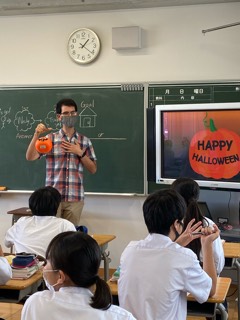 ウェスリーからは、ハロウィンについての紹介です。アメリカでのハロウィンを楽しむ家庭の様子を塚﨑先生と英語だけのShort Playを交えながらの紹介。