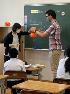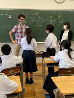 ウェスリーからのメッセージ:Learned about Halloween。They went Trick-or-Treating! Before they got a treat, they had to answer 1 question and make 1 question with their partner Tsukasaki - sensei and I think they did a great job!